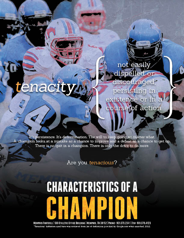 I wanted to take the "TIGERS" nickname and relate each letter in it to a characteristic of a champion. By doing so, I wanted to show that those characteristics define the Tigers program as well, showing their dedication to becoming a championship caliber program. I made each piece into a little mini-poster wit the definition of each characteristic going front and center. I really loved using the curly brackets to frame the definition as it gives a little elegant flair to an otherwise gritty series.